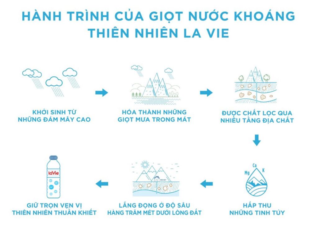 Khởi đầu bằng những giọt mưa tại những vùng núi xa xăm cách đây hàng trăm năm, thấm qua nhiều tầng địa chất, được chắt lọc một cách tự nhiên & tích tụ các khoáng chất thiết yếu, lắng đọng tại mạch nước khoáng nằm sâu hàng trăm mét dưới lòng đất, cách xa mọi ô nhiễm hoá chất & vi sinh vật. Tạo nên sản phẩm nước khoáng LaVie với sự kết hợp tuyệt vời giữa nguồn nước trong lành với 06 loại khoáng thiên nhiên, có vai trò rất quan trọng cho hoạt động của cơ thể.